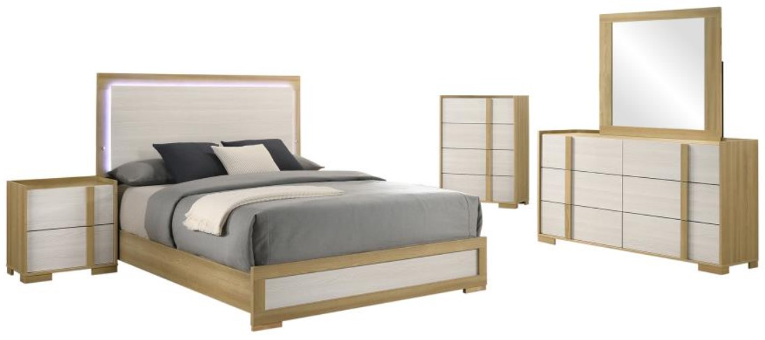 Includes: One (1) queen bed, one (1) nightstand, one (1) dresser, one (1) dresser mirror, and one (1) chest of drawers