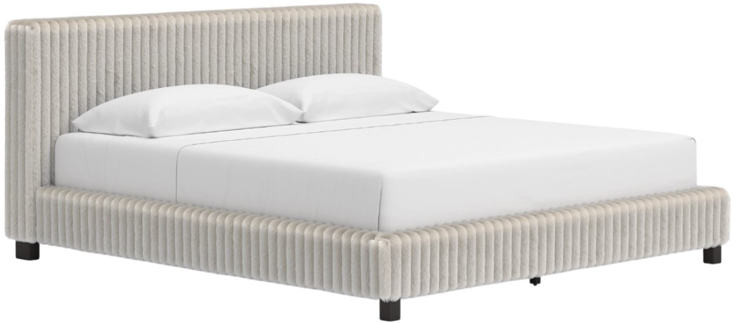 Includes upholstered panel headboard, panel footboard, platform rails and roll slats